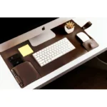 This full-grain leather desk mat features a comfortable, smooth surface that doubles as a mouse pad and writing pad. It offers wrist support for typing, writing, or using the mouse and stays securely in place thanks to its non-slip backing.
